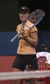 | Martina Hingis after her semi-final win over Sania Mirza at the Netaji Indoor Stadium on Saturday. Picture by Santosh Ghosh |