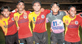 | East Bengal players — (from left) Jayanta Sen, Saumik Dey, M. Suresh, Abhra Mondal and Chandan Das — rejoice after winning the match against Mohun Bagan at Salt Lake Stadium on Tuesday. Picture by Gautam Bose |
