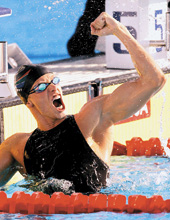 | Roland Schoeman celebrates winning the 50m butterfly gold with a world record at the World Aquatic Championships in Montreal on Monday. (Reuters) |