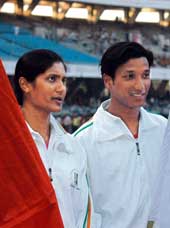 | Athletes Soma Biswas and Hari Shankar Roy during the opening ceremony of the Indo-Bangla Games at the Salt Lake Stadium on Saturday. A Telegraph picture |