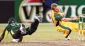 | Brett Lee tries to run out Rao Iftikhar during the first tri-series final in Melbourne on Friday. (Reuters) |