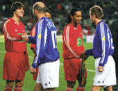 | (From left) Kaka, Zinedine Zidane, Ronaldinho and David Beckham exchange greetings before the tsunami relief benefit tie between World XI and European XI at the Nou Camp in Barcelona on Tuesday. (AFP) |