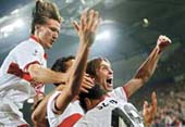 | VfB Stuttgart players rejoice after beating Manchester United 2-1 in the Champions League group match in Stuttgart on Wednesday. (AFP) |