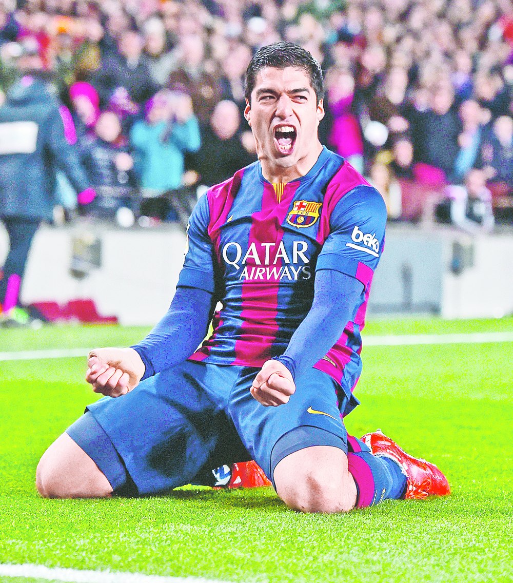 Barcelona’s Luis Suarez celebrates after scoring the winner against Real Madrid,