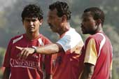 | Subrata Bhattacharya explains a point to Dipendu Biswas and McDonald Mukansi at practice on Saturday, the eve of East Bengal’s I-League opener vs Viva Kerala. A Telegraph picture |