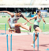 | Soma Biswas crosses a hurdle ahead of Sushmita Singha Roy at Salt Lake Stadium on Thursday |