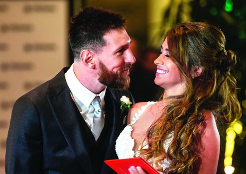 Lionel Messi and Antonella Roccuzzo pose for photographers after their wedding at the City Centre Complex in Rosario on Saturday. Argentine media called it the “wedding of the century” for Rosario, the northern port city where Messi, 30, and his bride, 29, met when the player was nine years old. Shakira and her husband, Gerard Pique, flew in to join the 260 guests including numerous footballers such as Messi’s Barcelona strike partners Neymar and Luis Suarez. Former Barca and current Chelsea star Cesc Fabregas was in attendance, along with Argentina and Manchester City striker Sergio Aguero. The party was to be a respite for Messi from his legal woes. A Spanish court last month rejected his appeal against a conviction for tax fraud. Following the private ceremony, the couple appeared happy and relaxed as they walked the red carpet at the hotel and casino complex. (AFP)