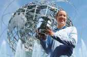 | Justine Henin-Hardenne with the US Open trophy in front of the Unisphere in New York on Sunday. (AP) |
