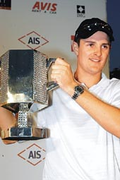 | Justin Rose of Britain with the Bilts Skins trophy in Gurgaon on Sunday. (AFP) |