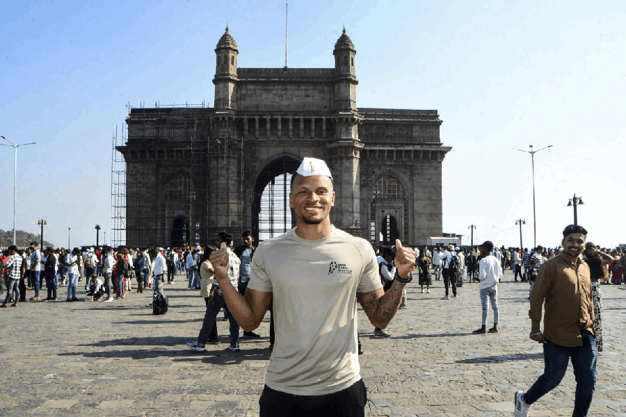 Andre De Grasse, International Event Ambassador for the Tata Mumbai Marathon 2026, at the Gateway of India in Mumbai, Thursday, Jan. 15, 2026. (PTI)