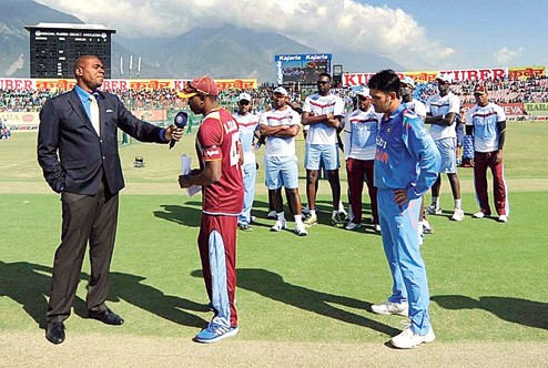 | West Indies captain Dwayne Bravo speaks to commentator Ian Bishop as teammates and Indian counterpart Mahendra Singh Dhoni listen, in Dharamsala, on Friday. Picture courtesy: BCCI |