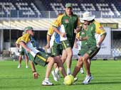 | Graeme Smith & Co. play soccer during training in Lahore on Tuesday. (AFP) |