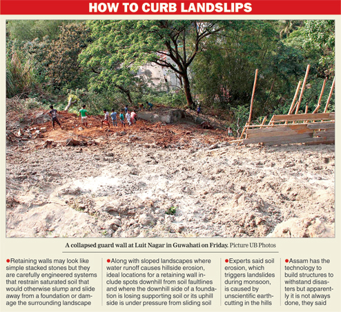 Throwing more light on structural safety, city-based consultant engineer J.N. Khataniar said, "Construction of a retaining wall involves engineering. The weight of the wall should be more than the water pressure from all sides. The depth of a structure on a slope depends on the flowing water pressure (that varies with the wall height) and the saturated soil pressure."