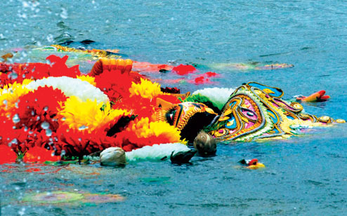 Immersion passed off peacefully with the district and police administration making adequate security and traffic arrangements to control the crowds. Revellers carried umbrellas or stood under shelters.