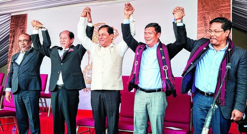 BJP president Amit Shah, defence minister Nirmala Sitharaman, Union minister of state for home Kiren Rijiju, North East Democratic Alliance convener Himanta Biswa Sarma, the chief ministers of five BJP-ruled/supported states in the Northeast - Sarbananda Sonowal (Assam), N. Biren Singh (Manipur), Pema Khandu (Arunachal Pradesh), Conrad Sangma (Meghalaya) and BJP national general secretary Ram Madhav attended.