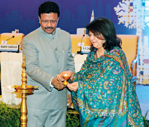| Urban development minister Firhad Hakim lights the ceremonial lamp with Rakhi Sarkar, managing trustee of KMOMA, at the inauguration of the Sound Square symposium on Thursday. (Amit Datta) |