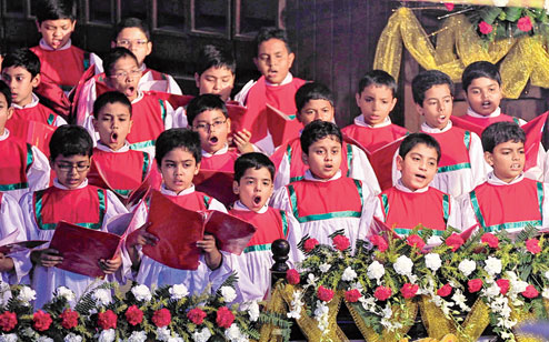 | The students of Calcutta Boys’ School usher in the Yuletide spirit at Thoburn Memorial Methodist Church. Picture by Arnab Mondal |