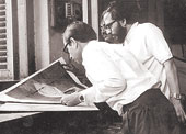 | Pradip Maitra, late Bikash Bhattacharjee and late Shyamal Datta Ray at the studio |