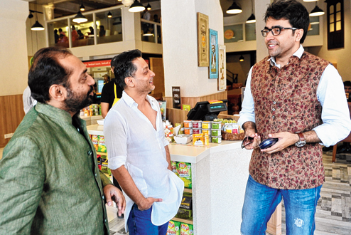 | (From left) Anindya Chattopadhyay, Sujoy Ghosh and Abir Chatterjee have a chat ahead of the session at Au Bon Pain. Picture by Anindya Shankar Ray |