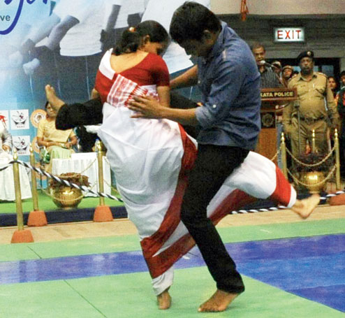 She turned him over and slammed him on the floor. He lay flat with folded hands. A group of women showed on Monday how to hit men where it hurts. The occasion was the launch of Sukanya, a Calcutta police initiative to train girl students of 32 schools across the city how to fight off the harasser. Metro had reported on February 20 how the lessons in fightback had become a necessity in a city that ranks third in crimes against women. A Class X girl