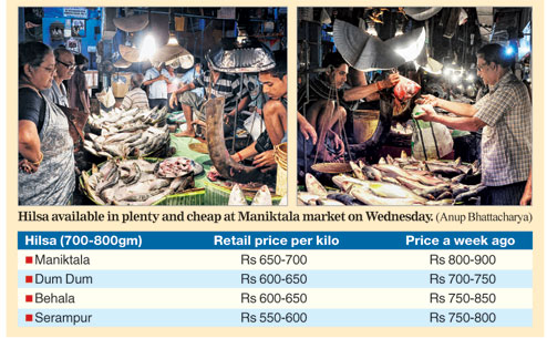 A silvery delight weighing between 700 and 800gm was being sold in the Maniktala fish market today for Rs 700, a price drop of Rs 200. In Behala, a fish of the same weight was even cheaper at Rs 650 a kilo. A week ago, anything in this range would sell for Rs 850.