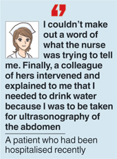 “Some nurses do speak a smattering of Hindi but the accent is so different that you can’t blame anyone for not understanding a word. I, for one, couldn’t make out a word of what a nurse was trying to tell me. Finally, a colleague of hers intervened and explained to me that I needed to drink water because I was to be taken for ultrasonography of the abdomen,” said a woman who had undergone treatment in a south Calcutta hospital.