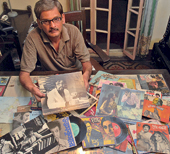 | Rudrajit Mookherjee with Uttam Kumar memorabilia from his collection. Picture by Amit Datta |