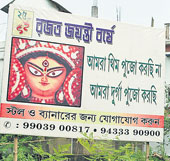 Some have attitude. “We do not do theme puja, we do Durga puja,” says one hoarding in Salt Lake. A closer look reveals the hoarding has actually been put up to seek advertisers for stalls and banners.