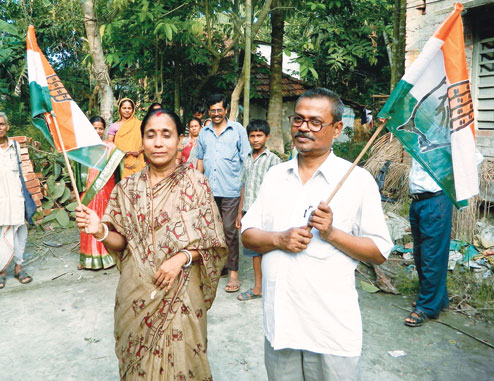 | Congress flags in hand, Bhowmik and his wife campaign in Gopalpur. Picture by Sudeshna Dutta |