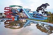 In the ride named Water Cyclone, there are four closed circular loops and two open-air semi-circular loops through which one slides down rubber mats for a thrill spill.