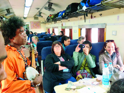 A while later, the irrepressible sound of Baul songs set to the rhythmic resonance of wheels on tracks stopped even those in a serious discussion on the trip to Tagore’s abode. Cristy Chung from San Francisco set her audio recorder on as the Bauls did a virtuoso song-and-dance performance in the compartment.