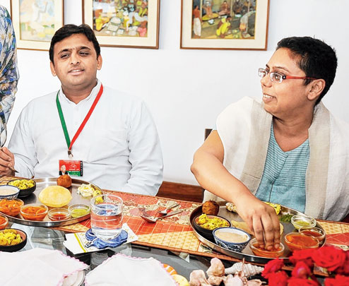| Akhilesh Yadav and Ruchira Gupta at lunch on Wednesday at her New Alipore residence. (Rashbehari Das) |
