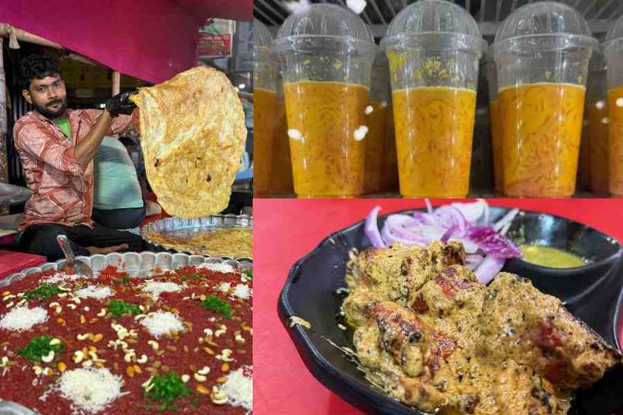 As we entered the main food street, I was amazed to see the incredible street food culture that thrives here, making it one of Calcutta’s liveliest culinary hubs. Makeshift food stalls line both sides of the street, creating a bustling bazaar filled with delicious aromas — from sunset into the early hours of sehri (the last meal before fasting). Mohabbat Ka Sharbat was right at the starting point with its subtle taste of Rooh Afza mixed with milk, watermelon and ice cubes, soothing the tastebuds just before the invigorating food trail was about to start. The beef kathi kebabs and khiri kebabs served from the heart by the owner Shadaab Ali at the New Lucknow Hotel are definitely to die for.
