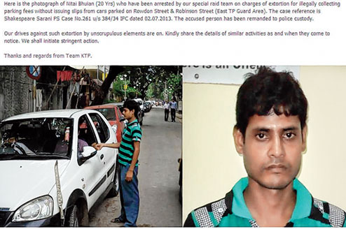 In a bid to encourage people to come forward and lodge complaints about extortion in the name of collecting parking fees, Calcutta traffic police have uploaded on Facebook the photographs and details of two of the arrested persons.