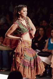 Rina Dhaka’s Fall 2006 collection boasted global silhouettes with delicate embellishments. Her palette was muted to start with ? grey, ecru, white and flesh primarily ? before moving on to rusts and blacks.There were bubble skirts, peasant dresses, sheer chiffon pants, empire line cocktail dresses, lacy kurtas with matching tights, figure-hugging minis, ajrakh coats and chiffon bubble dresses.