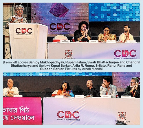 This was the motion at a debate held by Calcutta Debating Circle (CDC) at Lake Club recently. Chaired by cardiac surgeon and CDC managing trustee Kunal Sarkar, the debate, an Anandabazar Patrika and ABP Ananda event with The Telegraph as its partner, got off to a crackling start with the first speaker, journalist and writer Chandril Bhattacharya, unleashing his fury at the way the Bengali language is breaking down. In the audience sat poet Sankha Ghosh, to whom almost everyone on the stage paid a tribute, even as scholar Pabitra Sarkar, artist Shuvaprasanna and filmmaker Kamaleswar Mukherjee formed the panel of mentors.