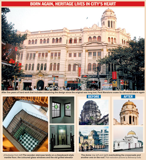 The restorers hired six masons from a Midnapore village who specialised in Armenian architecture to work on the arches and designs. “The stained glass was specially procured from old razed buildings. These were cut to fit the arched windows of Park Mansions,” Sanyal said.