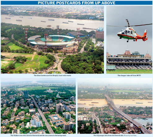 Calcutta cut a pretty picture from a helicopter on Sunday morning as it flew over the stately Victoria Memorial, the monsoon-green Maidan, vessels floating down the Hooghly and the two iconic bridges across it to mark the inauguration of a joyride.