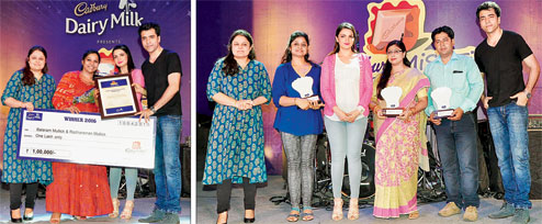 The grand finale of this year’s Cadbury Mishti Shera Shrishti, in association with Anandabazar Patrika and The Telegraph, unfolded at City Centre Salt Lake on Sunday evening, as popular sweet shop Balaram Mullick & Radharaman Mullick walked away with the winner’s prize from Tolly stars Abir Chatterjee (extreme right in picture left) and Tonushree Chakraborty (second from right), and Parul Sharma (extreme left), senior brand manager of Cadbury Dairy Milk. “We have been participating in this campaign since the first year. We are really excited as this is the third time we have won. Every year we look forward to this campaign and try to come up with new creations. Every participant is very good, so it is definitely a tough competition,” said Poppy Mullick (second from left in picture left) of Balaram Mullick & Radharaman Mullick. The month-long mishti campaign, that saw three Chocochefs emerge out of more than 700 contestants through a series of judgements, gave the 23 participating sweet shops three recipes to choose from and recreate at their outlets — Choco Delight, Cream Chocolate and Choco Pop Tart. It was a double delight for Nandini Dutta (third from right, in picture right) as she was crowned Cadbury Mishti Shera Shrishti Most Popular Chocochef 2016, apart from being Cadbury Mishti Shera Shrishti Chocochef 2016, along with Goutam Das (second from right) and Sulakshana Basu (second from left).