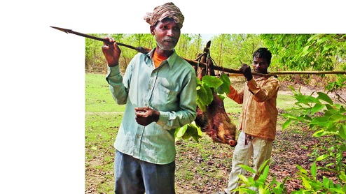A few minutes away, in a small clearing, we come upon a hunting party. There are about 20-odd men, some sitting on a broken culvert. They haven't chanced upon a kill yet and speak with caution, as if not wanting to let out the secrets of the task in which they excel. Some of them are from Jhitka, a tiny hamlet on the forest outskirts; others are from villages further away. They are headed to Pakhibaand, where hunters from all directions are supposed to assemble after killing their trophy animals.