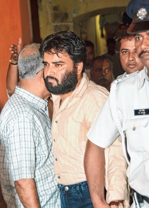 | The 2003 picture shows Aftab Ansari (bearded) being escorted out of a special court set up at Presidency jail to hear the American Center attack case |