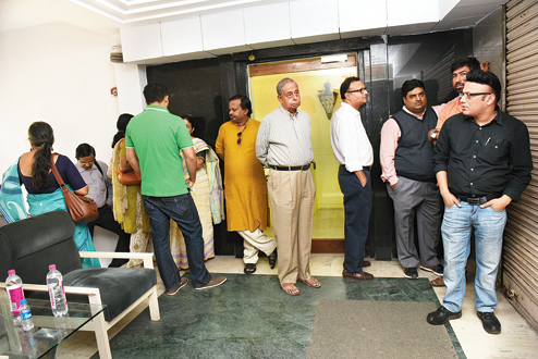 Q FOR ART NOT ATM: Art enthusiasts, Art Mela regulars, first-timers... all fell into queue just before the clock struck 11 and the shutters of CIMA Gallery opened for the three-day mela on Friday. The first six in queue? (R-L) Krishnendu Ghosh, Jyoti Chatterjee, Sushil Chowdhury, Aditya Rungta, Deepak Mitra and Subhobrata Ghosh