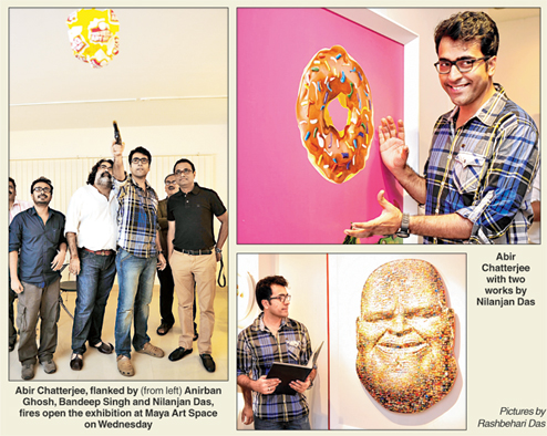 The bubble refused to burst. Actor Abir Chatterjee could accomplish his mission with a toy pistol only after three tries. Confetti cascaded out of the balloon and scattered all over the floor as it exploded. Minuscule images used in the artwork on show was turned into confetti.