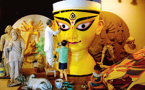The “Krishnagar studio” by Subir Pal depicts an artist painting a massive head of Durga with a boy holding a pot of paint. A girl sits in the foreground, and behind her are the statues of Rabindranath and Nazrul Islam and several images in the making of the goddess. Another giant fibreglass head of Durga will merge with the torso and nether limbs of the goddess, painted Kalighat pat style, only blown up several times over.