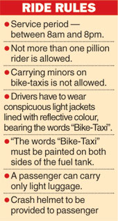 Bike-taxi operators in New Town are required to have a fleet of at least 15 motorbikes and a contract carriage permit. Fares would be dictated by the market "with no government interference", the official said.