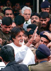 | If the fog didn’t get you at the airport on Friday morning, fan-fare did. The VIP exit at the domestic terminal was a sea of pre-paid taxi drivers, airport staff members and devotees, as chants of “Amitabh, Amitabh…. Don, Don… ” rent the morning air. Amitabh Bachchan stepped out after 9.30 am, looking relaxed in a white sweatshirt. Picture by Aranya Sen |