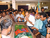 | (From top) BJP workers pay their last respect to Nripen Mondal at the party office in Malda on Monday, driver Nirmal Prasad who suffered bullet injuries in Malda Medical College and Hospital and Nripen Mondal. Pictures by Surajit Roy |