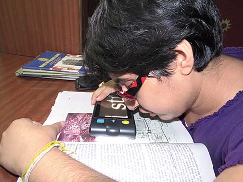 Shreya turns on the gadget and bends over a text book with it, her nose almost touching the page. The letters appear on the screen, magnified to about 400 per cent. “I can change the colour too from what is printed in the text.” She uses the cheaper variety which costs about Rs 30,000.