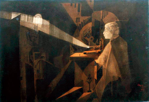 Signed November 17, 1925, this painting adorning a wall at Acharya Bhavan — 93 APC Roy Road next to Rajabazar Science College and the Bose Institute — could also be interpreted as the light of knowledge shining outwards from the gadget.