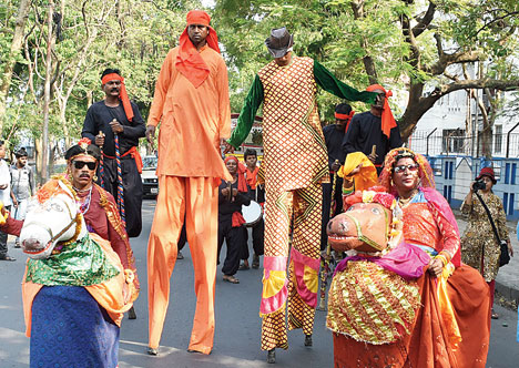 Bidhannagar Bangla Nabo Barsho Udjapon committee had also got stilt walkers, women dhakis from Purulia, singers and dancers who performed using miniature horses as props. “Poila Baisakh would be incomplete without music so we all sang songs like Esho he Baisakh and Dhitang dhitang bole,” said Sanchita Ghosh of IA Block. Maya Mitra blew the conch shell.
